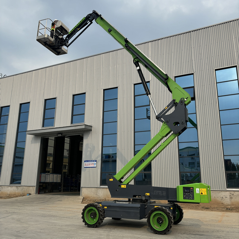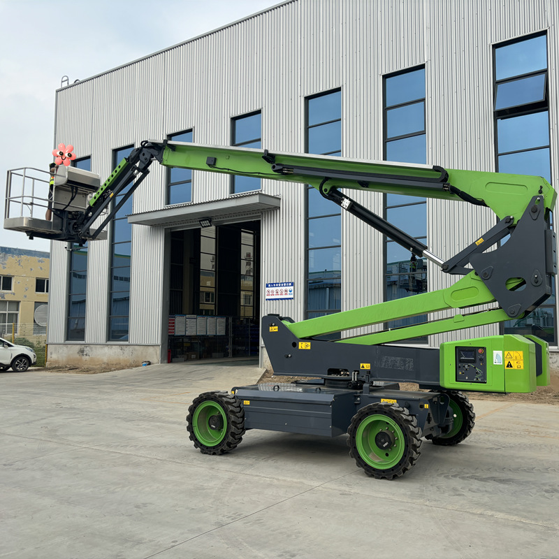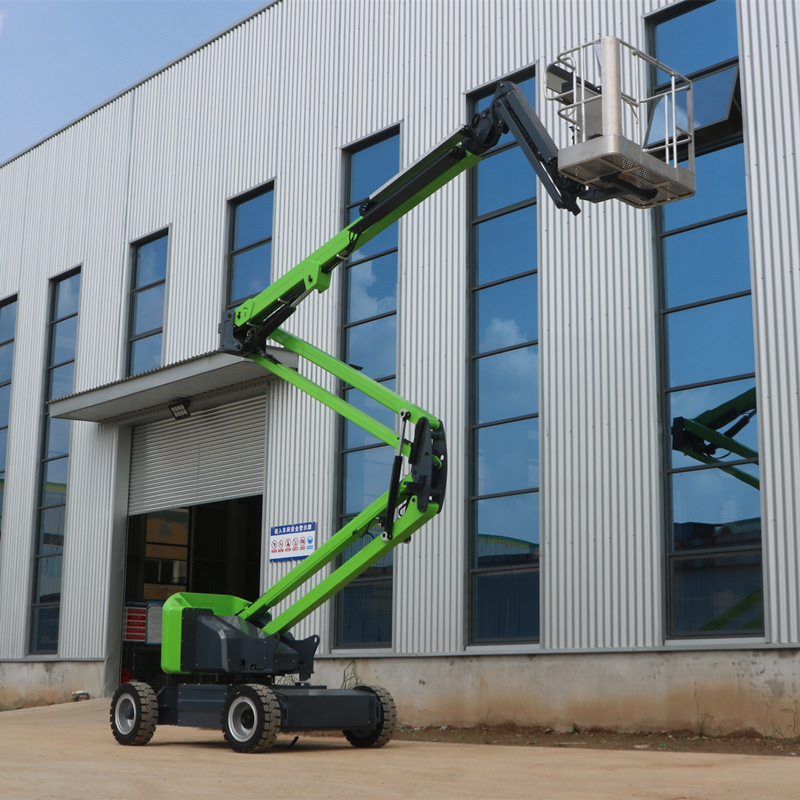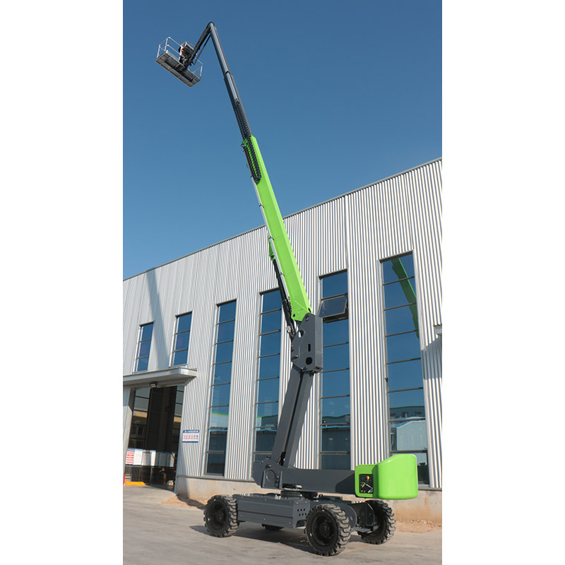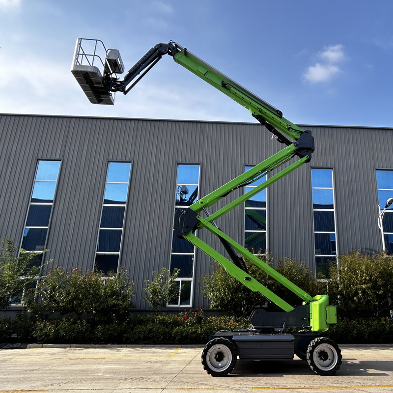 1. Dismount assembly The dismount assembly consists of base, fuel tank and power unit hydraulic assembly, steering mechanism assembly, battery and other and related hydraulic, electrical components. The running mode is motor-driven, and the tires are made of high-load solid rubber tires. Meet the driving requirements of vehicles in different environments. When driving on a ramp, the running mechanism has a self-braking function, and there is also a clutch mechanism to facilitate towing in case of failure. The steering mechanism adopts a hydraulic cylinder-driven linkage steering mechanism, which gives the machine an ultra-tight internal turning radius, allowing the platform to adapt to tight environments. 2. Curved arm assembly The composite mechanism of folding arm and sleeve telescopic arm is used to make the movement of the mechanism more flexible and improve work efficiency. Using high-strength materials, the weight of the entire crank arm assembly is reduced, increasing the stable performance of the machine. 3. Electrical system The electrical system adopts CAN bus control technology, the base and platform are set up with control panels, the platform is set up with displays, and the CAN bus is used to communicate between the turntable and the platform controller to realize the control of machine movements. The main functions of the electrical system are realized: steering and ride control of the chassis; The rotation of the turntable, the rise and fall of the curved arm, and the telescopic action of the extension arm. Implemented security protection measures: The control system integrates tilt sensing to limit the rise and movement of the machine in hazardous ground conditions; Load alarm system, if the safety load is exceeded, the machine will automatically alarm; The handle is integrated with an interlock switch to prevent the machine from moving when the handle is accidentally touched; When the machine loses power, the ground operator can use the hand pump equipped with the machine to retract the telescopic arm; When the machine is in the raised state, it is automatically limited to low speed travel; The two wheels are automatically locked when parking, and the brakes are automatically released when the hydraulic force is driving. 4. Hydraulic system The hydraulic system is driven by a pump, which is directly driven by a battery to power the hydraulic system. The hydraulic assembly adopts components provided by Hydraforce in the United States, and the hydraulic system adopts electro-hydraulic proportional control technology, which can achieve smooth operation of the machine. Walking is divided into two levels: high and low. The lifting cylinder is equipped with a buffer mechanism to make the final descent action smooth; The balance valve on the cylinder ensures that the cylinder does not automatically descend when the hydraulic hose breaks; leveling the cylinder ensures that the working groove is automatically leveled throughout the working phase of the machine; The machine cylinder is equipped with an emergency drop valve, which allows the platform to descend at a smooth speed in case of unexpected failure and lack of power, ensuring the safety of personnel.