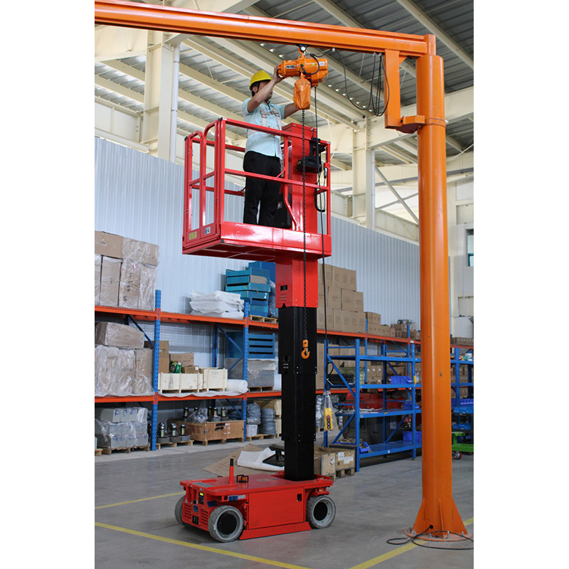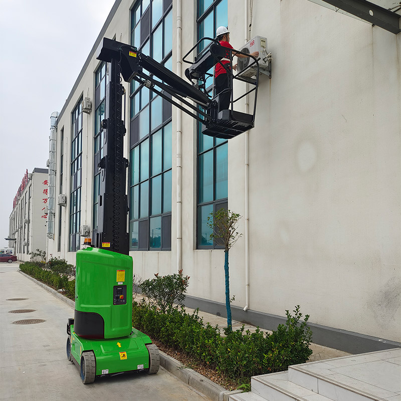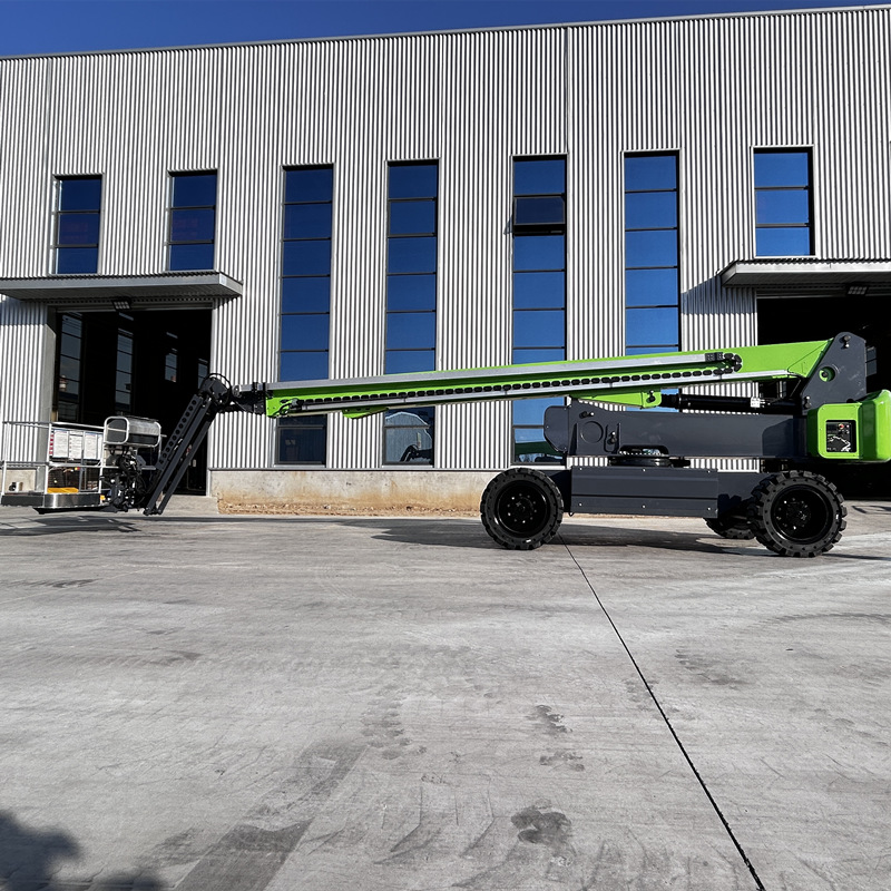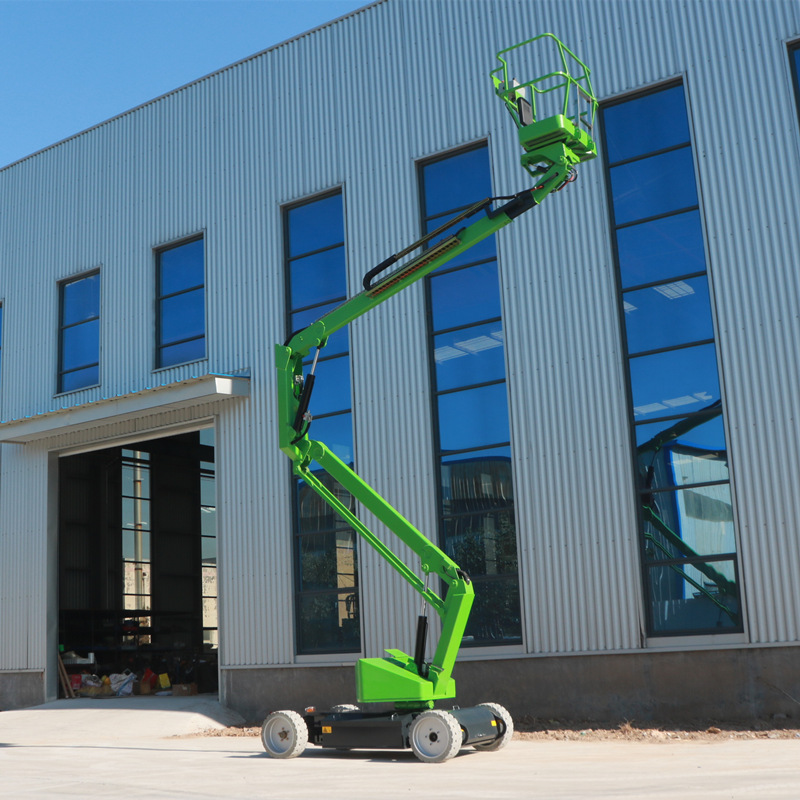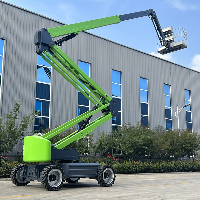 1. Dismount assembly The dismount assembly consists of base, fuel tank and power unit hydraulic assembly, steering mechanism assembly, battery and other and related hydraulic, electrical components. The running mode is motor-driven, and the tires are made of high-load solid rubber tires. Meet the driving requirements of vehicles in different environments. When driving on a ramp, the running mechanism has a self-braking function, and there is also a clutch mechanism to facilitate towing in case of failure. The steering mechanism adopts a hydraulic cylinder-driven linkage steering mechanism, which gives the machine an ultra-tight internal turning radius, allowing the platform to adapt to tight environments. 2. Curved arm assembly The composite mechanism of folding arm and sleeve telescopic arm is used to make the movement of the mechanism more flexible and improve work efficiency. Using high-strength materials, the weight of the entire crank arm assembly is reduced, increasing the stable performance of the machine. 3. Electrical system The electrical system adopts CAN bus control technology, the base and platform are set up with control panels, the platform is set up with displays, and the CAN bus is used to communicate between the turntable and the platform controller to realize the control of machine movements. The main functions of the electrical system are realized: steering and ride control of the chassis; The rotation of the turntable, the rise and fall of the curved arm, and the telescopic action of the extension arm. Implemented security protection measures: The control system integrates tilt sensing to limit the rise and movement of the machine in hazardous ground conditions; Load alarm system, if the safety load is exceeded, the machine will automatically alarm; The handle is integrated with an interlock switch to prevent the machine from moving when the handle is accidentally touched; When the machine loses power, the ground operator can use the hand pump equipped with the machine to retract the telescopic arm; When the machine is in the raised state, it is automatically limited to low speed travel; The two wheels are automatically locked when parking, and the brakes are automatically released when the hydraulic force is driving. 4. Hydraulic system The hydraulic system is driven by a pump, which is directly driven by a battery to power the hydraulic system. The hydraulic assembly adopts components provided by Hydraforce in the United States, and the hydraulic system adopts electro-hydraulic proportional control technology, which can achieve smooth operation of the machine. Walking is divided into two levels: high and low. The lifting cylinder is equipped with a buffer mechanism to make the final descent action smooth; The balance valve on the cylinder ensures that the cylinder does not automatically descend when the hydraulic hose breaks; leveling the cylinder ensures that the working groove is automatically leveled throughout the working phase of the machine; The machine cylinder is equipped with an emergency drop valve, which allows the platform to descend at a smooth speed in case of unexpected failure and lack of power, ensuring the safety of personnel.